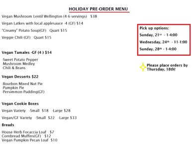 Let us do the cooking for you and your dearest this holiday season! We have a delectible selection of vegan and gluten free options to choose from to make the perfect menu for your special meal. Contact us with any questions or stop in to chat with us in person.